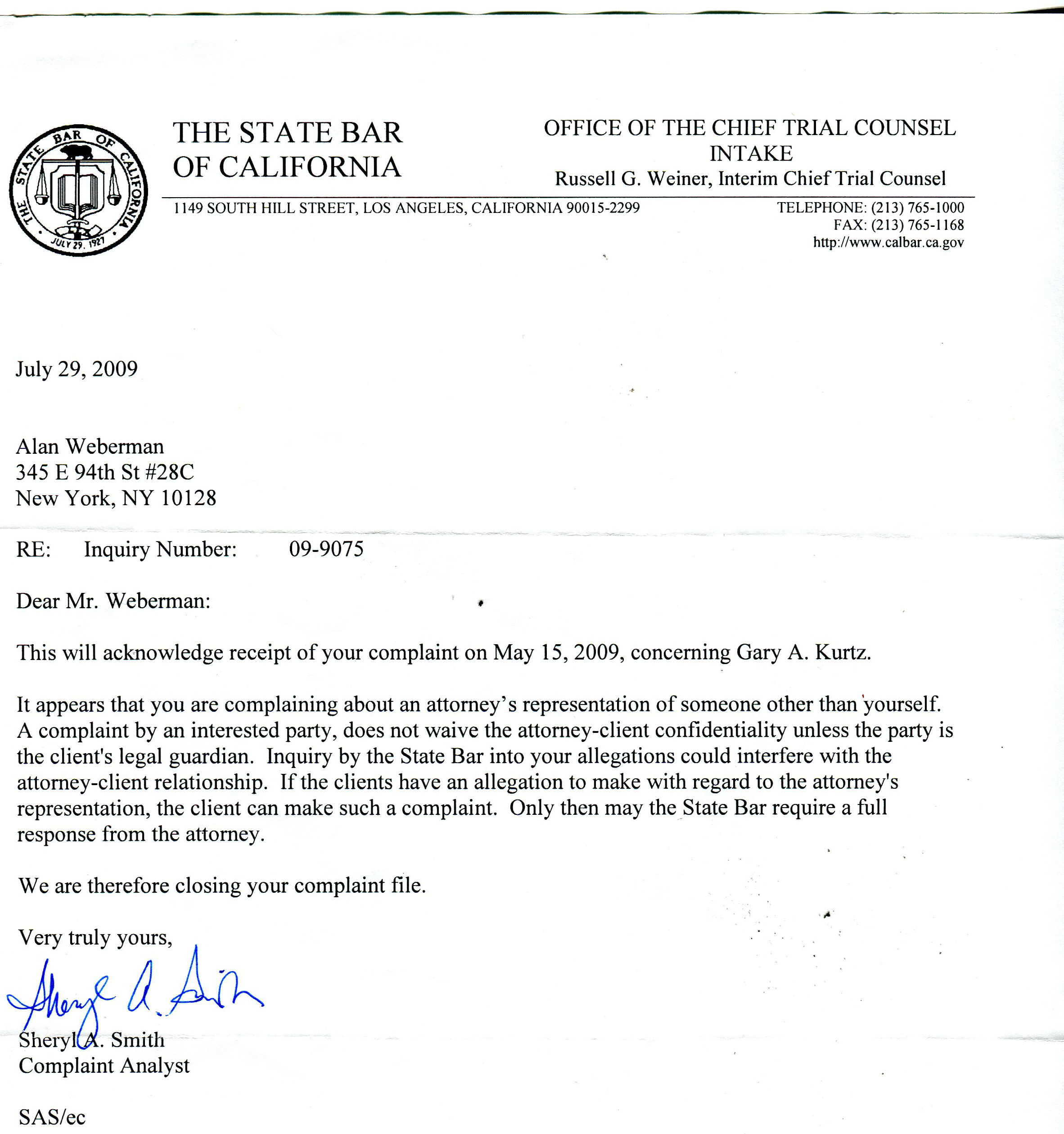 COMPLAINT ABOUT KURTZ TO CALIFORNIA BAR ASSOCIATION