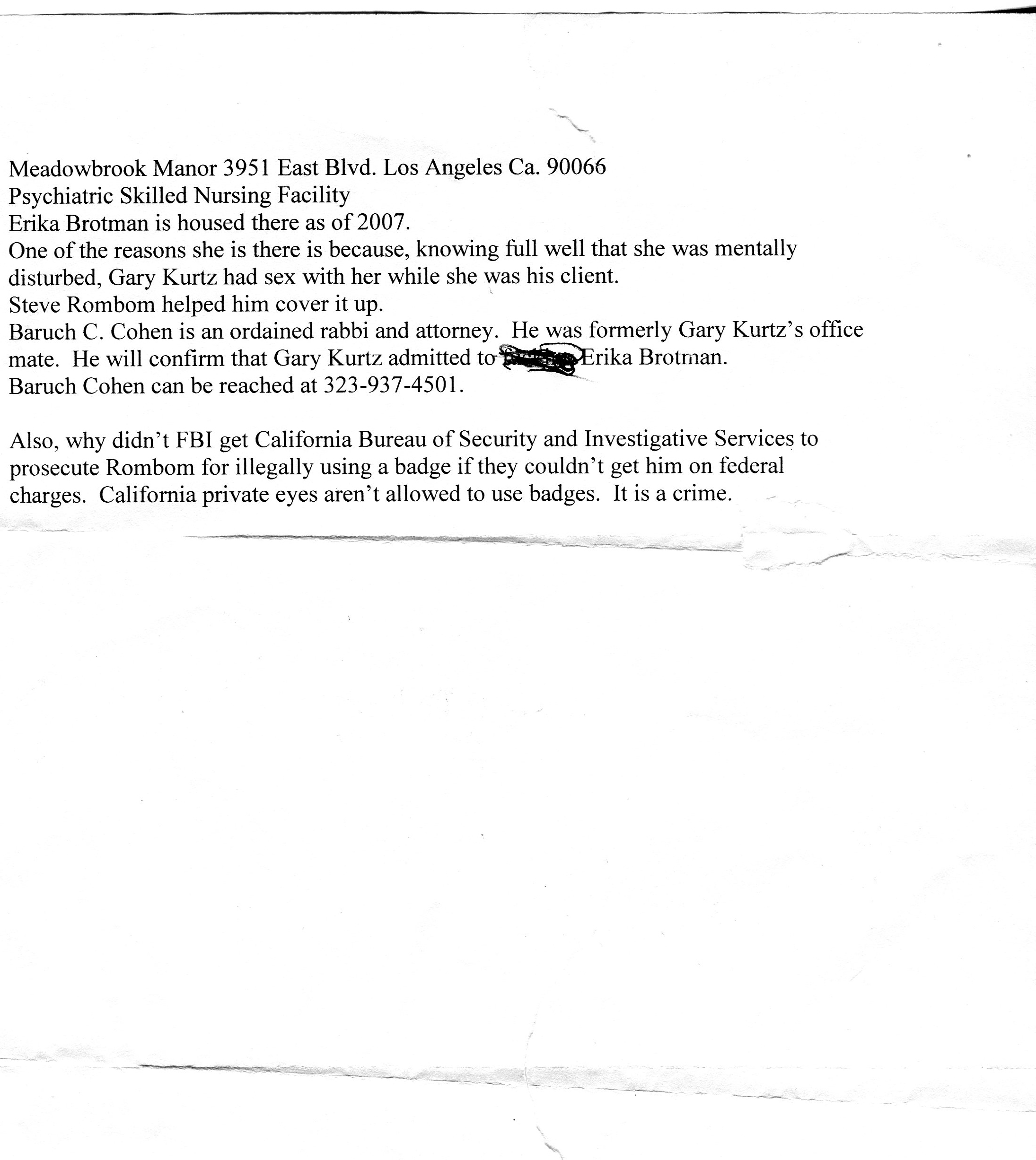 Baruch Cohen is an ordained rabbi and attorney. He was formerly Gary Kurtz's office mate. He will confirm that Gary Kurtz admitted to fucking Erika Brotman. Baruch Cohen can be reached at 323-937-4501.Also why didn't the FBI get California Bureau of Security and Investigative Services to prosecute Rombom for illegally using a badge if they couldn't get him on federal charges. California private eyes aren't allowed to use badges. It is a crime.